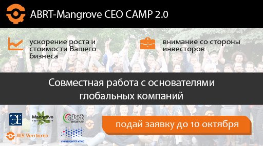 Приглашаем принять участие в ABRT-Mangrove СEO Camp – это 8 недель интенсивной работы в Санкт-Петербурге и Кремниевой долине для амбициозных CEO и основателей ИТ-компаний из России, стран СНГ и Европы. Результатом станет значительное увеличение продаж, новые заказчики и партнеры на международном рынке. Бизнес-школа RMA выступает информационным партнером мероприятия.