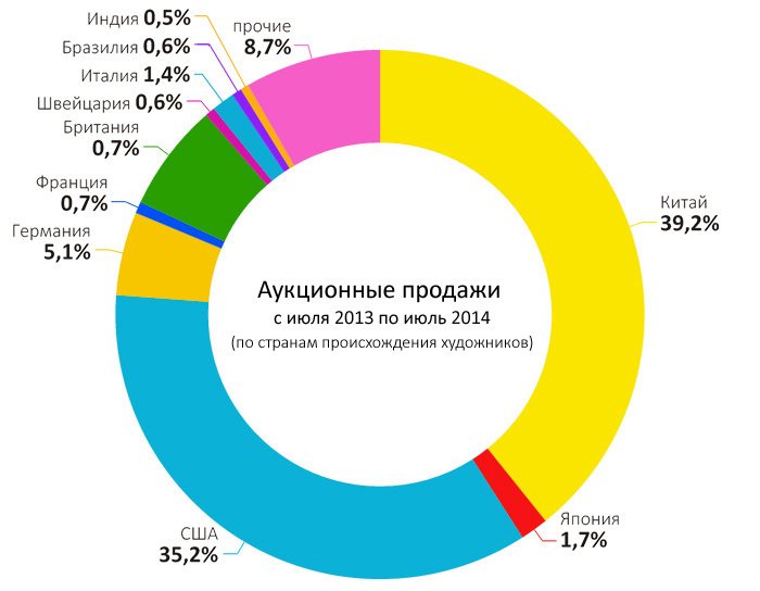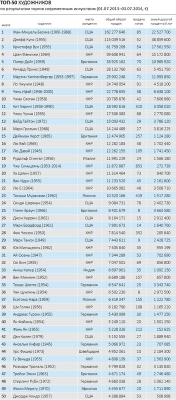 Портал Artprice.com, крупнейшая онлайн-база цен на искусство, опубликовал свой ежегодный доклад о состоянии мирового рынка современного искусства, подготовленный на основе данных об аукционных продажах в период с 1 июля 2013 по 3 июля 2014 года включительно. Предлагаем вашему вниманию материал «Артгида», который внимательно изучил доклад и опубликовал самые интересные факты.