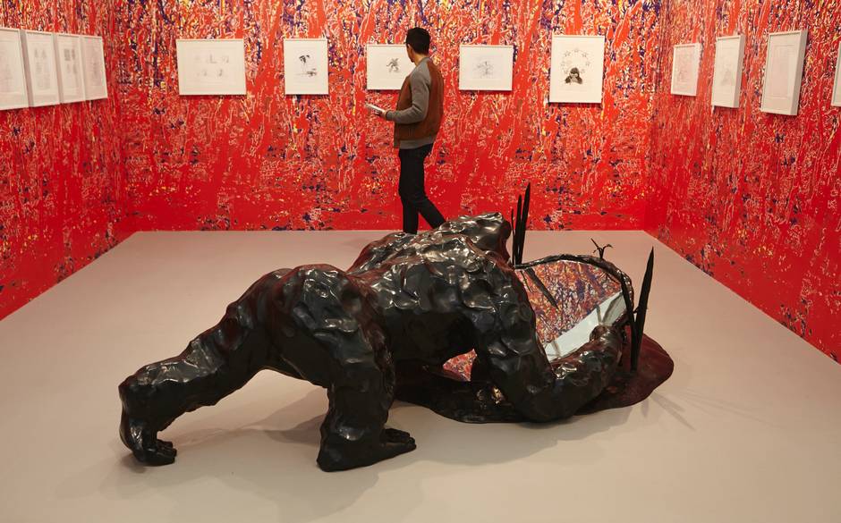 Среди других творчески подошедших к вопросу дилеров — Антон Керн, проделавший в пустых серых стенах своего стенда два отверстия в форме бриллиантов, в которые зритель может увидеть три скульптуры, созданные в этом году Марком Гротьяном (одна из них была сразу продана за $500 тыс.), и коллекцию бисерных масок племени табва середины ХХ века (семь из них уже проданы по цене от $9 тыс. до $40 тыс.). СтендEsther Schipper украшают обои с цветущей вишней авторства Томаса Деманда (€45 тыс.; одно из трех изданий было продано в день открытия), а на стенде галереи Lissonвнимание зрителей приковывает к себе радужный ковер (2014, $115 тыс.). Его автор —Кори Аркенджел, который, кроме того, придумал униформу для сотрудников галереи.
