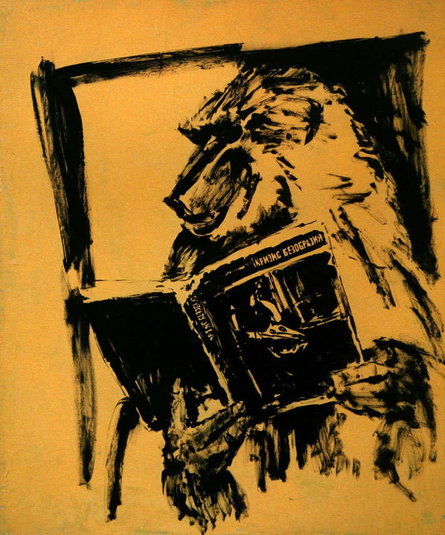 «Параллельно я занимался живописью в духе «дзенской» мазни. Я сделал выставку под названием «Я чужой на этом празднике жизни», одним из главных героев проекта стали обезьяны, с любопытством, недоумением, тоской и завистью взирающие на современный мир, читая известные книжки по искусству. Эти обезьянки, как художник, который никуда не может вписаться, асоциален, как говорит Кабаков: «Художник – это существо, которое не может жить по расписанию»