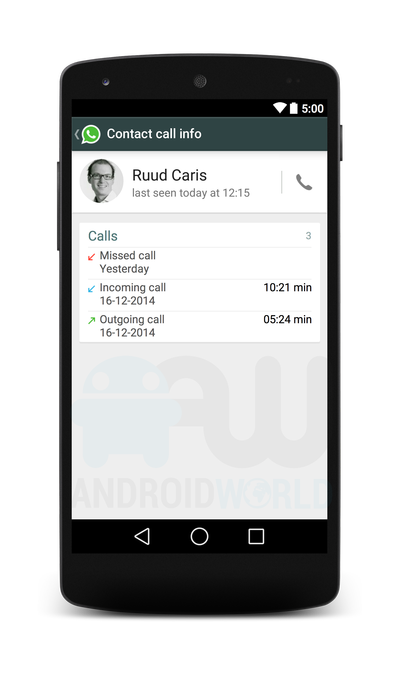 В распоряжении издания оказались скриншоты интерфейса предполагаемой новой версии WhatsApp для Android-смартфонов. Исходя из них, во время разговора центральное положение на экране будет занимать аватарка абонента, сверху будет отображаться информация о длительности текущего звонка и о том, что он выполняется через WhatsApp. Внизу располагается большая прямоугольная кнопка для начала или завершения звонка.