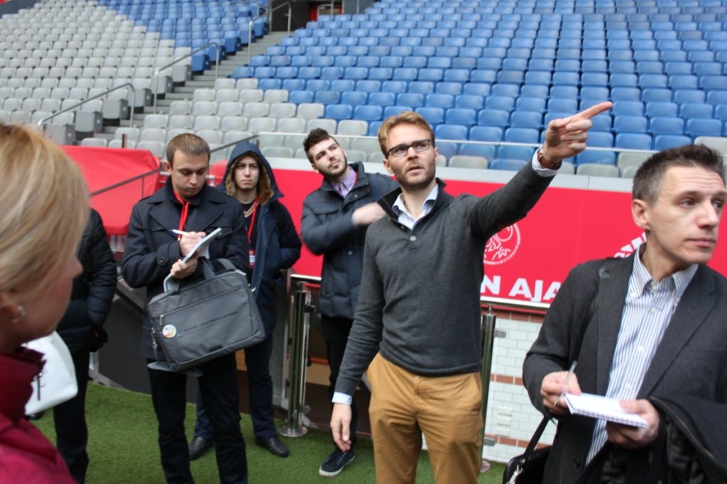 О том, как работает и зарабатывает домашний стадион «Аякса» участникам германо –голландской стажировки Red-White Business Tour, организованной бизнес-школой RMA для студентов факультета «Менеджмент в игровых видах спорта» и его партнеров, рассказал руководитель проектов компании Amsterdam Arena International Джем Бемстербур.