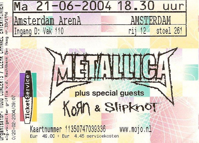 Билет на концерт Metallica, состоявшийся на "Амстердам Арене" в мае 2004 года