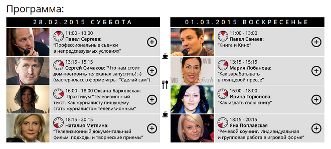 Время и место проведения: 28 февраля и 1 марта 2015 года, учебный центр RMA (улица Нижняя Сыромятническая 10, строение 12), 5 этаж. Мастер-классы проходят с 11.00 до 20.15.