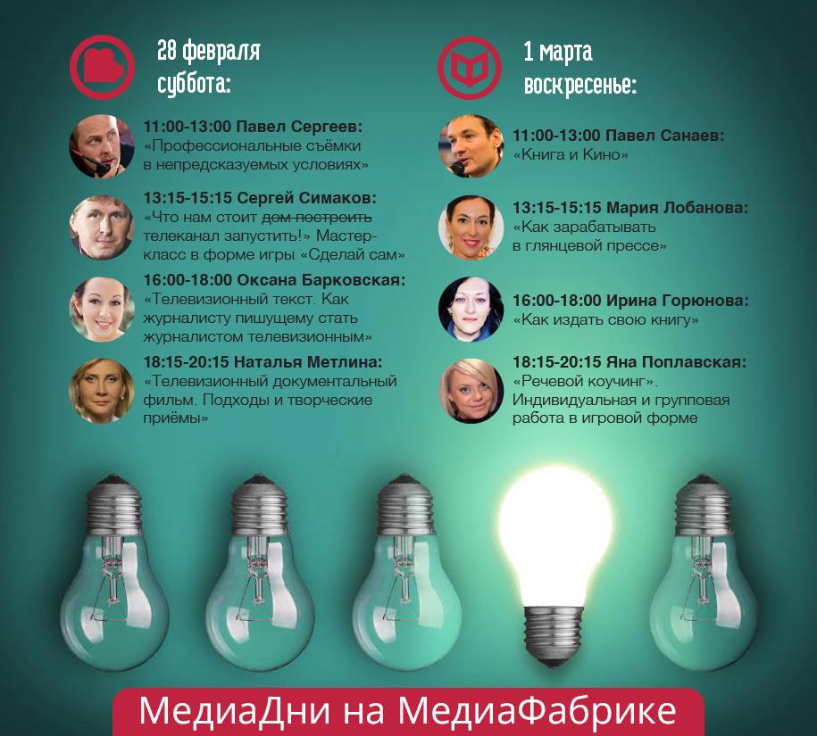 Первый день работы Медиафабрики – 28 февраля – будет посвящен проблематике телевидения. Среди приглашенных спикеров журналист Наталья Метлина и Оксана Барковская - продюсер документального кино. Вместе со слушателями они обсудят, как правильно использовать творческие приемы в телевизионнной документалистике, как грамотно журналисту работать с телевизионным текстом, стоит ли запускать в кризис новый телеканал, как полностью использовать возможности непрофессионального оборудования для профессиональных съемок.