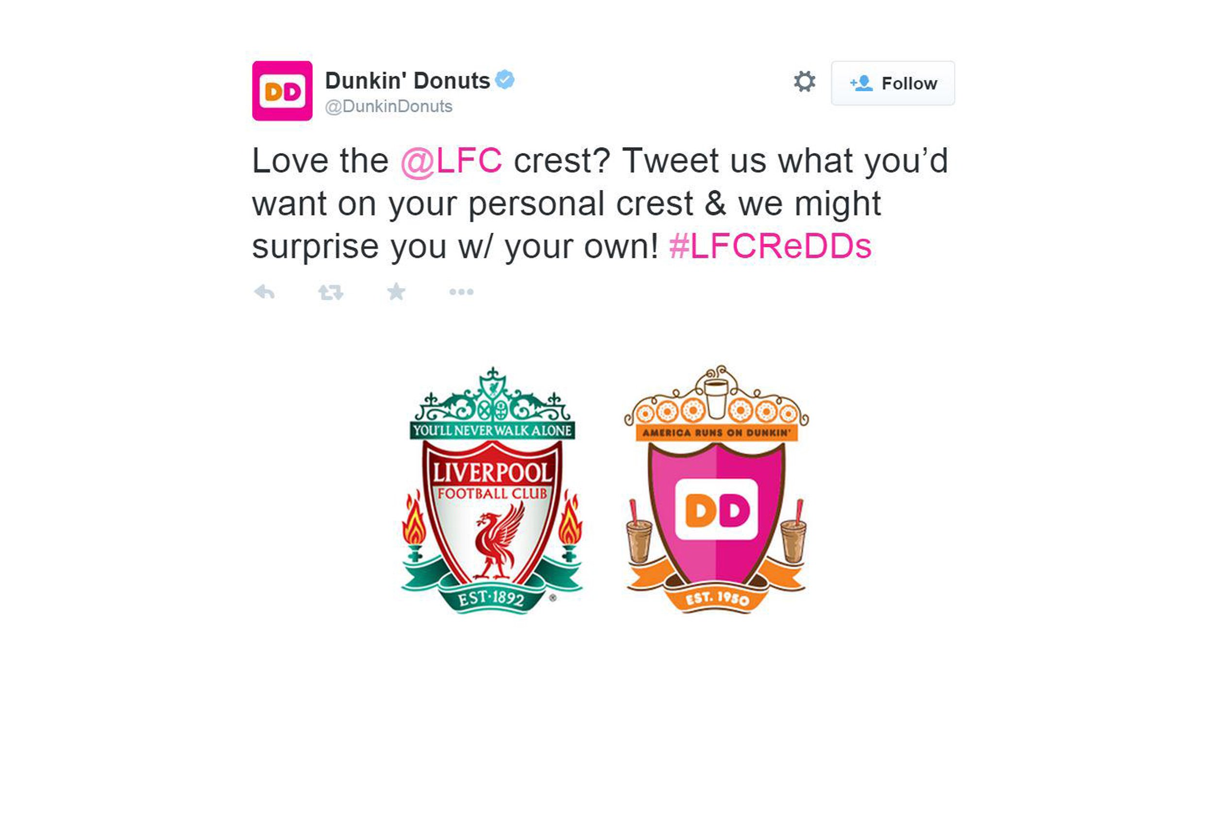 Dunkin’ Donuts заменила вечный огонь стадиона Hillsborough на изображения молочных коктелей на гербе клуба. Также вместо ворот стадиона, находящихся в верхней части эмблемы, компания разместила там изображения донатсов и кофе, а легендарная надпись «Ты никогда не останешься один» была заменена на рекламный слоган. Картинка в сети Twitter сопровождалась подписью: «Любите герб «Ливерпуля»? Напишите нам, что вы хотите увидеть на своем собственном гербе и мы сделаем его для вас!»