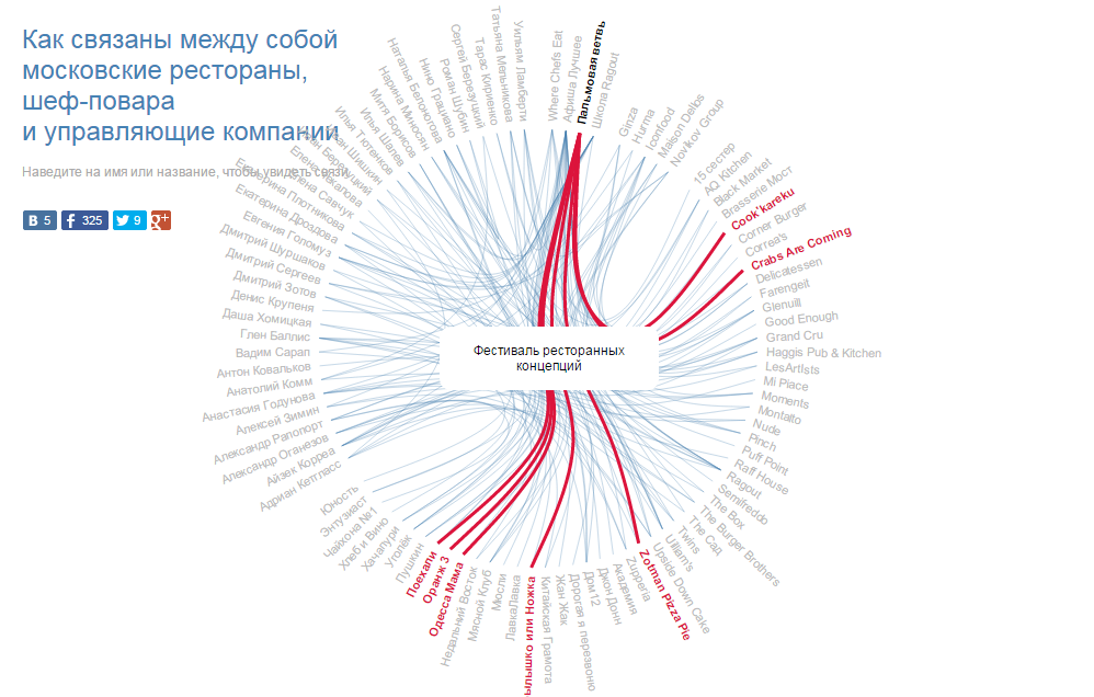 Чтобы понять, с кем и где работает определенный человек, нужно навести курсор на его имя. Например, повара Илью Шалева автор связал с школой Ragout (он один из основателей), международным гастрономическим гидом Where Chefs Eat (в 2015 году Шалев оказался одним из двух российских шефов, которые рассказали в сборнике о своих любимых местах), рестораном Ragout, из которого повар ушел в 2014 году, и заведением Мити Борисова «Дом 12», где он трудится сейчас.