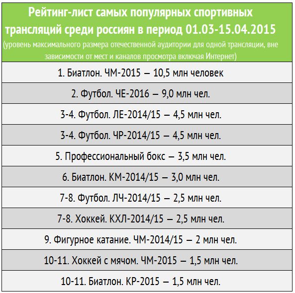 Сегодня одним из главных критериев успешности экономики любых спортивных соревнований и их отдельных участников является внимание телевизионной и сетевой аудитории к соответствующим трансляциям. В начале весны прошли соревнования по ряду популярных видов спорта (чемпионат и Кубок мира по биатлону, отборочный матч футбольной сборной к ЧЕ-2016, футбольные еврокубки и чемпионат страны, чемпионат мира по фигурному катанию, плей-офф КХЛ, гонки Формулы-1) — и их можно сравнить по числу отечественных телезрителей, пишет «Чемпионат».