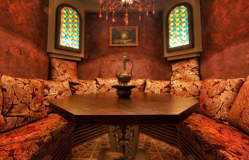 В меню представлены блюда восточной кухни, как знакомые и любимые многими – долма, хачапури, лагман, плов, манты, так и относительно новые для неискушенного посетителя. Вас непременно удивит огромный выбор шашлыков и других мясных блюд, жареных на углях, а восточные сладости пахлава, канафи не оставят равнодушными ни вас, ни ваших детей. В меню вы также найдете халяльные блюда, большой выбор традиционных и национальных напитков, кальяны от сирийского мастера по секретным рецептам. Фирменные кальяны: «Мохито», «Глинтвейн», «Зеленая фея», «Волшебный кальян».