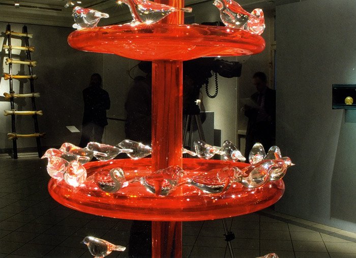 В результате в экспозиции можно увидеть те работы, которые устроили авторов проектов после остывания стекла, на что требуется полтора месяца. Среди них - небольшого размера «Арка жизни» Ильи и Эмилии Кабаковых, «Большой брат» Сонг Дога, по виду напоминающий традиционную люстру из мурановского стекла с камерами наблюдения, «Поток II» арт-группы Recycle и «Черная медуза» Куна Ванмехелена. Ее венчают не только змеи, но и куриные головы. Впрочем, по признанию художника, ни одна птица не пострадала ради искусства - все они умерли естественной смертью и только после попали в руки таксидермиста.