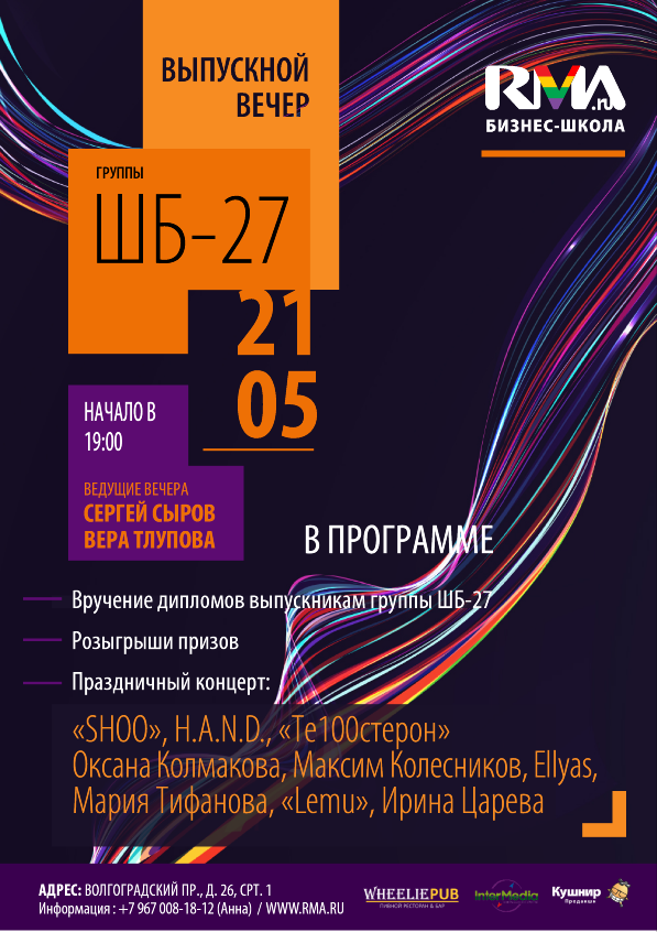 21 мая 2015 года в клубе WheeliePub, состоится вручение дипломов выпускникам группы ШБ-27 факультета «Менеджмент в музыкальном бизнесе и индустрии развлечений» бизнес-школы RMA.