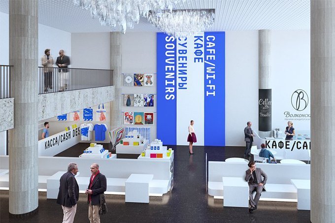 Что касается холла, то концепция предполагает создание внутри музея сувенирного киоска и Wi-Fi зоны. «В работе над реконструкцией пространств холла большое значение придавалось очищению интерьера от наносных элементов и сохранению ощущения его масштаба и пустоты при включении в пространство новых функций и, соответственно, новых форм. Важным было спроектировать такие новые архитектурные элементы, которые не противоречили бы ни своей формой, ни фактурой оригинальным отделочным материалам и архитектуре здания», — говорят авторы дизайн-проекта.