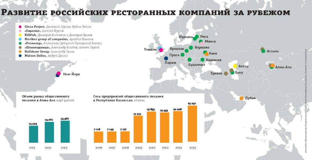 У холдинга Ginza Project есть опыт управления проектами за рубежом — успешно работают его рестораны в Нью–Йорке и Лондоне. Открытие в Алма–Ате ознаменует выход Ginza Project в Азию. В России под управлением холдинга находятся 74 ресторана, и в этом году, несмотря на кризис, компания активизировала развитие. Как сообщалось ранее, в стадии активной подготовки находятся как минимум пять ресторанных проектов в разных районах Петербурга. Стратегический план — запуск 11 ресторанов в среднесрочной перспективе. По экспертным оценкам, оборот компании в 2014 году составил около 13 миллиардов рублей.
