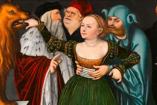"Она посвящена редкой теме, в роли "уст истины" в данном случае выступает лев, но навеян сюжет древней маской речного бога в портике базилики Санта-Мария в Риме, которая долгое время считалась одной из главных городских достопримечательностей и даже появляется в фильме "Римские каникулы" с Одри Хепберн. Согласно поверью, тот, кто положит руку в рот богу и солжет, лишится руки" - пояснил ранее агентству представитель аукционного дома. На картине Кранаха изображена женщина, которую муж обвиняет в измене и которая, чтобы спастись от позора и спасти свою руку, придумала такой ход: она попросила любовника нарядиться в шута и обнять ее перед тем, как она положит руку в пасть льву, чтобы иметь возможность сказать: "Ко мне никогда не прикасался ни один мужчина, кроме моего мужа и этого шута рядом со мной".