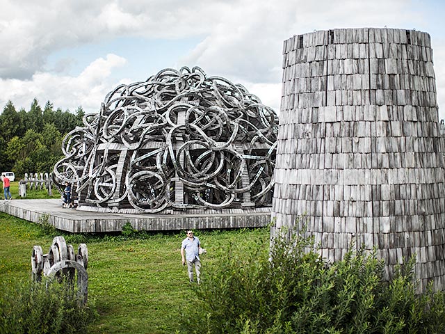 Замыкает этот треугольник "Сельпо" Полисского. Местные рабочие, которых он называет своими соавторами, нанизывали необработанные березовые бруски разной формы на железные палки. Материал собрали "по сусекам" - что осталось от других работ, а часть средств - через краудфандинг (из нужных 1 млн рублей собрали 700 тыс.).