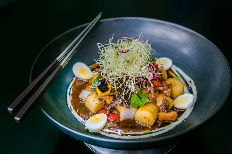 Цитата из меню: юкхве (тартар из говядины, заправленный кунжутным маслом с добавлением груши, кедровых орешков, перепелиного яйца и джема из кимчи) – 470 руб., кимчи манту (пельмени ручной лепки из говядины с кимчи) – 650 руб., кальби ччим (маринованные говяжьи ребра, подаются с капустой брокколи, грибами шимиджи и шиитаки с добавлением кунжутного масла, женьшеня, жожоба и орехами гинко) – 920 руб.
