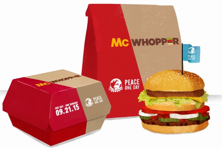 Сеть ресторанов быстрого питания «Бургер Кинг» предложила конкурентам из «Макдоналдса» совместно создать бургер в рамках некоммерческого проекта Peace One Day («Однажды в мире»), сообщает Business Insider. Бутерброд, по задумке инициаторов коллаборации, будет представлять собой смесь фирменных сэндвичей обоих брендов, «Биг-Мака» и «Воппера», и будет называться «МакВоппер».