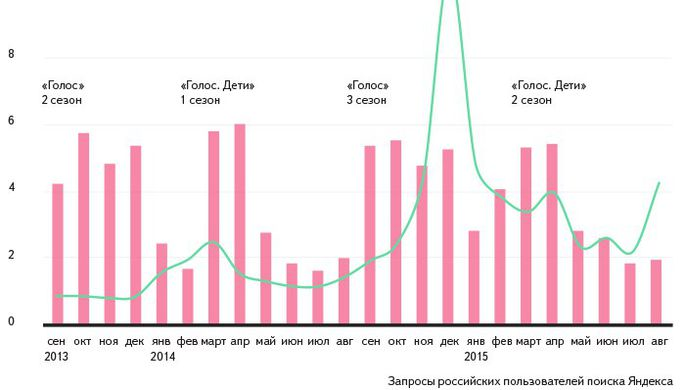 По данным «Яндекса», уровень поискового интереса к «Голосу» по числу запросов можно сравнить с интересом к новостям о курсе доллара. Так, за неделю с 31 августа по 6 сентября, во время начала нового, четвертого сезона проекта, россияне задали более 900 тысяч запросов о «Голосе», причем больше всего запросов пришлось на следующий день после премьеры.