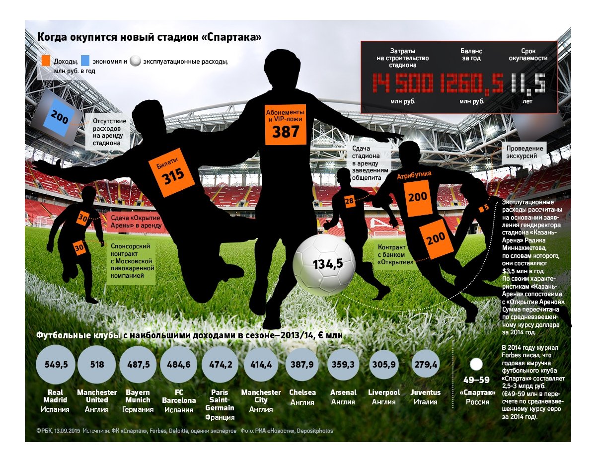 За календарный год со дня первого матча на «Открытие Арена» было сыграно 23 матча: 18 домашних игр «Спартака», три игры сборной России, товарищеский матч с «Црвеной звездой», а также формально выездная для «Спартака» игра с московским «Торпедо», которое арендовало спартаковский сезон из-за плохого состояния газона в Раменском, где проводили свои игры торпедовцы. Еще один раз, в июне 2015 года, стадион целиком сдавался в аренду под концерт британской рок-группы Muse. Свои финансовые показатели «Спартак» не раскрывает. Коммерческий директор клуба Александр Атаманенко обещает обнародовать основные цифры в октябре. Однако и без официальной отчетности вполне можно просчитать примерную выручку клуба на основании открытой информации.