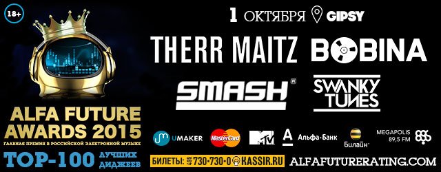 1 октября в клубе Gipsy состоится первая российская профессиональная премия в области электронной музыки Alfa Future Awards. Во время церемонии будут награждены топ-10 лучших диджеев России из сотни рейтинга Alfa Future Rating и лауреаты в в шести специальных номинациях. Для студентов и выпускников бизнес-школы RMA предоставляется скидка 50 % на участие в мероприятии.