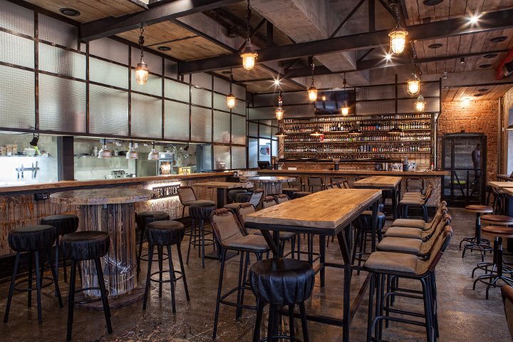 Некрашеные бетонные стены, беленый кирпичный простенок, открытые конструкции потолка, умело заляпанный краской бетонный пол и такая же стойка открытой кухни, кабельная катушка, столы из видавшей виды доски-пятидесятки — грубость, грубость и еще раз грубость. В таком контексте даже смертельно надоевшие лампы Эдисона смотрятся как влитые, будто горели здесь с самого начала. Самое удивительное, что принадлежит весь этот поствикторианский хардкор тем же владельцам, что и кафе «Рулет» на Цветном, — олицетворение уюта в московском смысле.