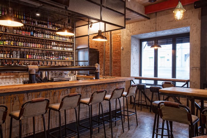Главную дизайнерскую роль в Beer Happens сыграли, как ни странно, шеф-повар Тимур Абузяров и шеф-бармен Роман Воротников — после того как они расчертили, где должна быть открытая кухня, где бар, где холодная комната для пива, оказалось, что остальные квадратные метры естественным образом превратились в классический пабовый «трамвай с загогулиной». Оформление происходило так же: когда сняли подвесной потолок, обнаружили под ним несущие балки. Самую кривую из них зашили в дерево, а прочие оставили как есть. Когда сняли разнообразную плитку с пола, поняли, что находящийся под ней бетон надо почистить и покрыть лаком. Единственную художественную ноту привнесла художница Елена Метревели: брызги краски на полу и на стойке — ее рук дело. Все остальное имеет коллективное авторство: Абузяров говорит, что помогли многочисленные друзья. Следует оговориться, что почти всю мебель делали российские мебельщики, а чтобы получить наконец нормальные тарелки, пришлось основать собственное керамическое производство.