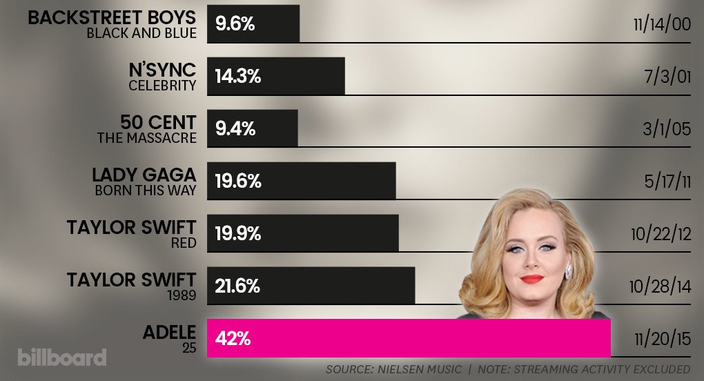 Исследователи Луис Агуйар и Джоэль Вальдфогель называют это «подходом Тэйлор Свифт». В конце 2014 года певица удалила свой альбом из Spotify, так как прослушивания в сервисе отрицательно сказывались на продажах. То же сейчас происходит и с альбомом Адель — когда первый период взрывных продаж пройдёт, альбом наверняка появится во всех стриминговых сервисах.