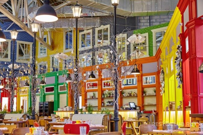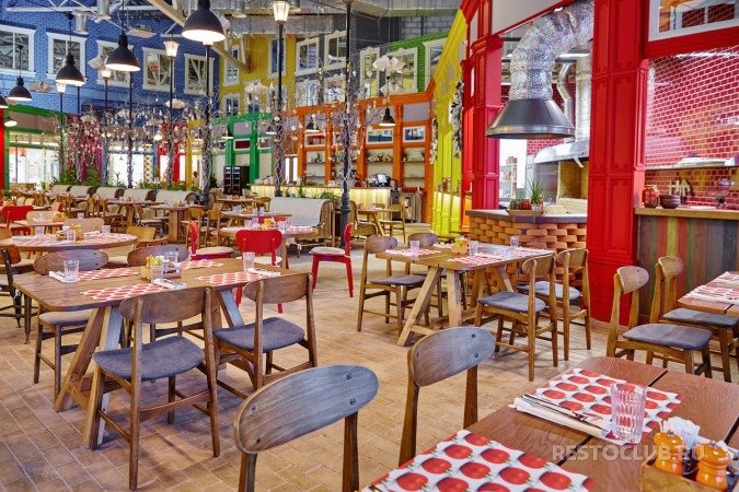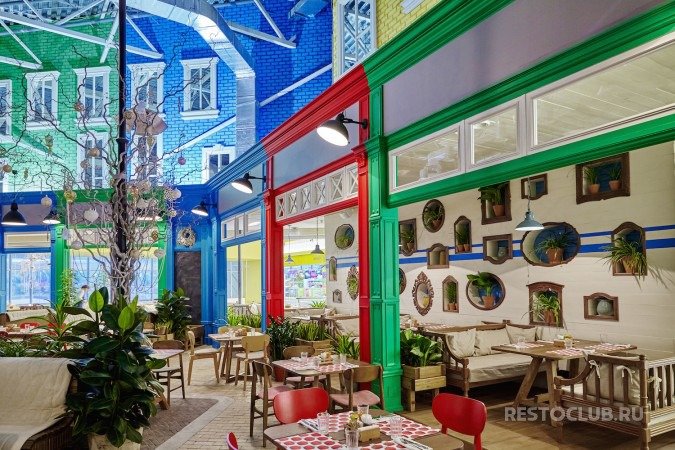 Ресторан занимает помещение площадью порядка 1000 квадратных метров на втором этаже торгового центра и может принять до 210 гостей. Интерьер разработал архитектор Андрей Цыганков: один большой зал оформлен в стиле двора-атриума. Пол выстелили уличной плиткой, на разноцветных стенах разместили фальшокна, вдоль зала установили фонари, укутанные ветками-лианами. В панорамных окнах – вид на спортивно-концертный комплекс «Петербургский».