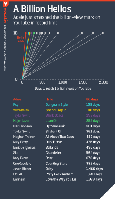 Полную информацию о клипах, набравших миллиард просмотров, можно рассмотреть на графике, который обнародовал портал VEVO.