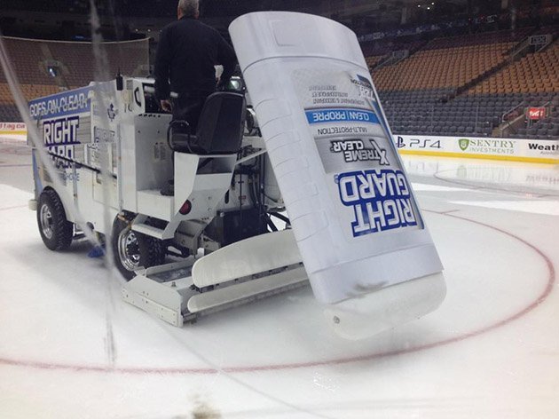 … Ну, и чтобы закончить эту тему, расскажу вам еще про то, как мы продвигали Right Guard, это дезодорант, продукт Schwarzkopf & Henkel, еще одного партнера «ТМЛ». Там мы тоже отталкивались от их слогана -- «Xtreme Clear» (Экстремальная чистота). Помню, я подумал: интересно, что могло бы с такой чистотой ассоциироваться применительно к хоккею? А потом понял: лед, заливочная машина. И вот мы наши заливочные машины в Air Canada Center именно таким образом и декорировали – превратили их в такие вроде как гигантские тюбики дезодоранта со снятыми крышками, параллель в общем ясна: абсолютно чистый лед – абсолютно чистое тело.