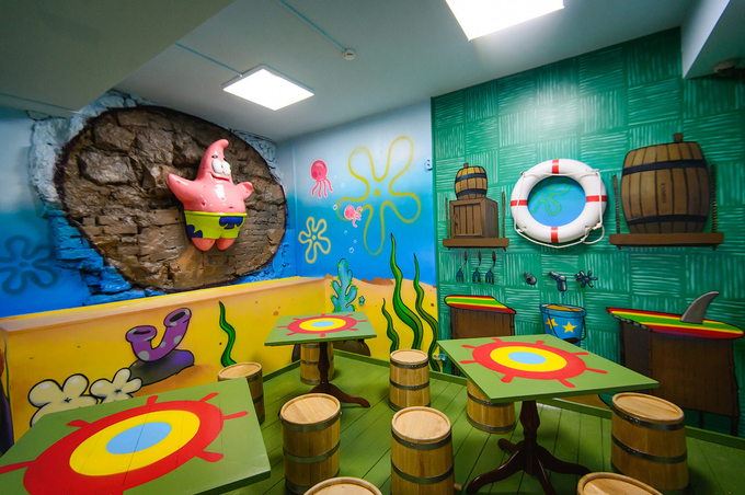 Посередине кафе дизайнеры поставили домик в виде ананаса, в котором живёт Спанч Боб, стены здесь разрисованы героями мультика, а вместо стульев — бочки как в кафе из мультфильма. Все официанты одеты в футболку с изображением Спанч Боба, а на голове они носят кепки, как у работников «Красти Краб» в мультике.