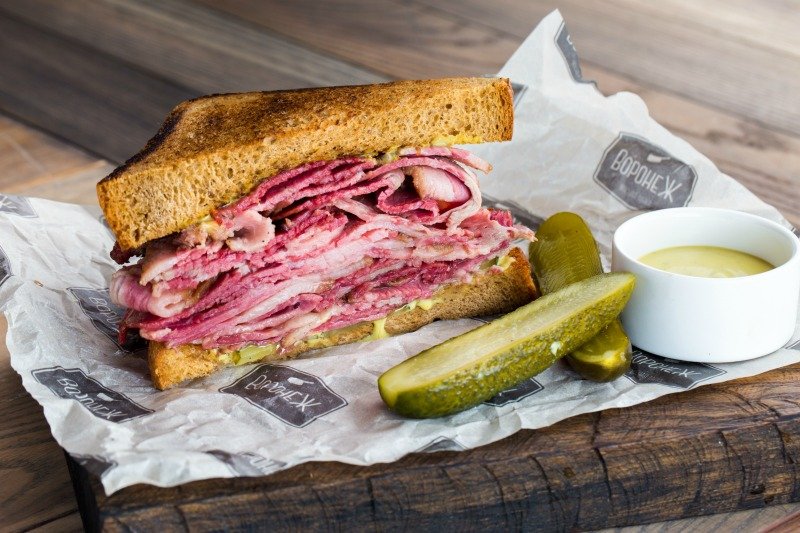 Это такой сэндвич, его рецепт в конце XIXвека в Америку привезли евреи –ашкеназы. В Нью-Йорке есть такой известный ресторан – KatzDeli, вот там мы с Раппопортом это блюдо и подсмотрели: он ведь, как и я, тоже долго в Штатах жил. Если об ингредиентах говорить, то пастрами это говяжья грудинка, в течение нескольких дней выдержанная в рассоле, а потом еще и закопченная. Мясо тонко режется, укладывается на ржаной хлеб. Плюс горчица. Вкус – изумительный. Мы этих сэндвичей по 40 килограммов в день продаем.