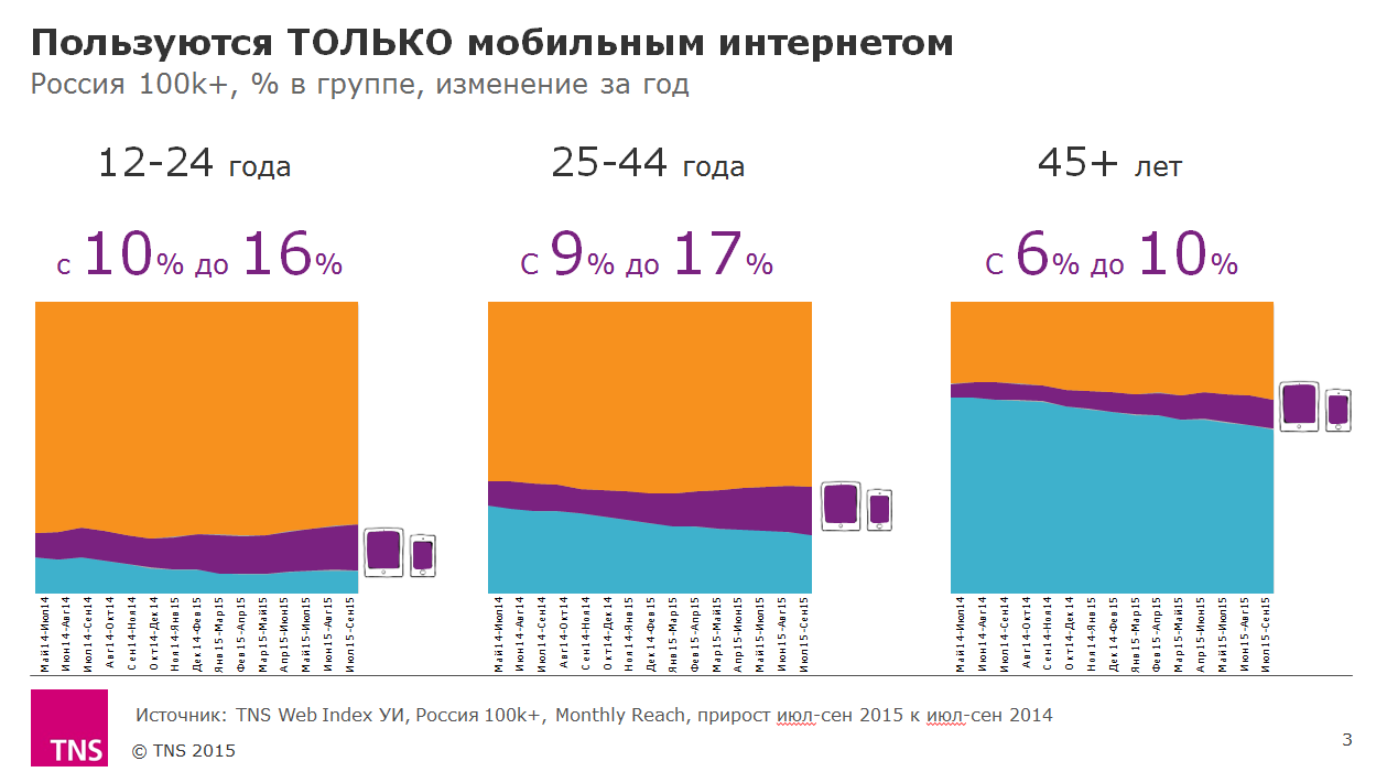 Этот показатель несколько варьируется в зависимости от возраста – среди пользователей постарше эта группа уже, нежели среди более молодых пользователей Интернета: если в группах 12-24 и 25-44 доля эксклюзивных мобильных пользователей составляет 16% и 17% соответственно, то в группе 45+ таких людей только 10% среди всех пользователей Интернета.