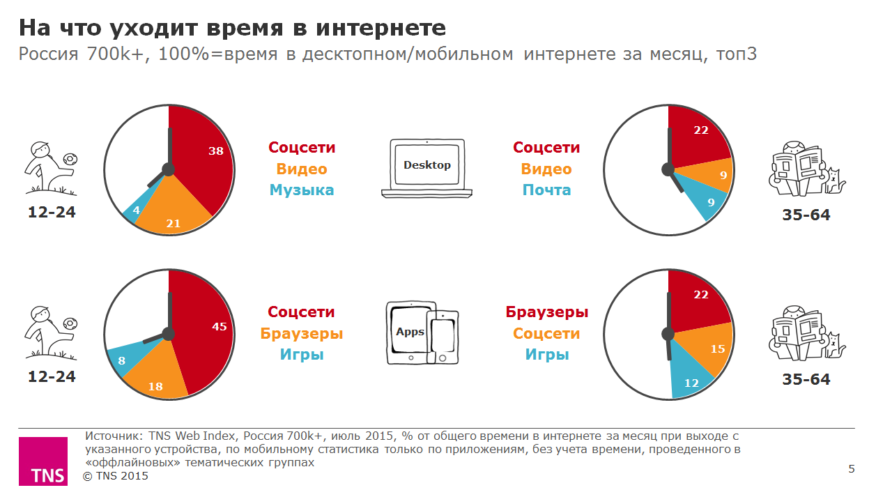 Лидером по доле времени в Интернете являются социальные сети – больше трети всего времени пользователи проводят именно там.