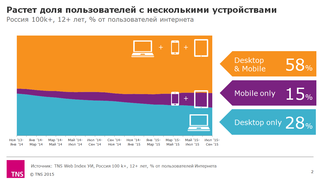 Основная часть аудитории – чуть меньше 60% – выходят в Интернет как со стационарных компьютеров / ноутбуков, так и через мобильные устройства, около трети все еще используют только десктопные устройства для выхода в сеть, но доля эксклюзивных десктопных пользователей ежегодно снижается.