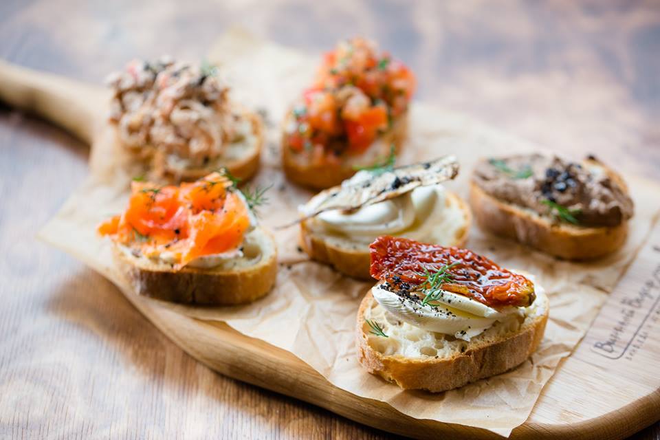 В меню есть брускетты (95 рублей), зелёный салат с фермерской бурратой (610 рублей), улитки по-бургундски (490 рублей), язык на гриле (480 рублей), мидии, томлённые в томатном соусе (480 рублей), а также паста (370–450 рублей) и супы (320 рублей).