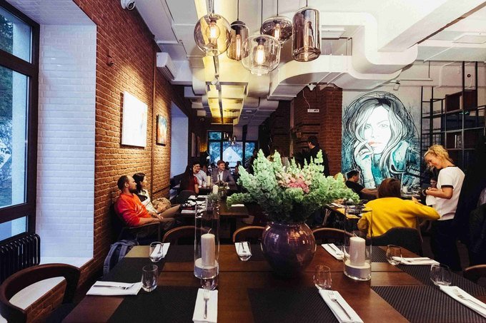 Интерьер: Интерьер ресторана выполнен в стиле лофт с акцентом на красный кирпич и белый мрамор. Также внутри много цветов и зелени. А при входе посетитель видит голубое граффити во всю стену. Кухня в ресторане открытая.