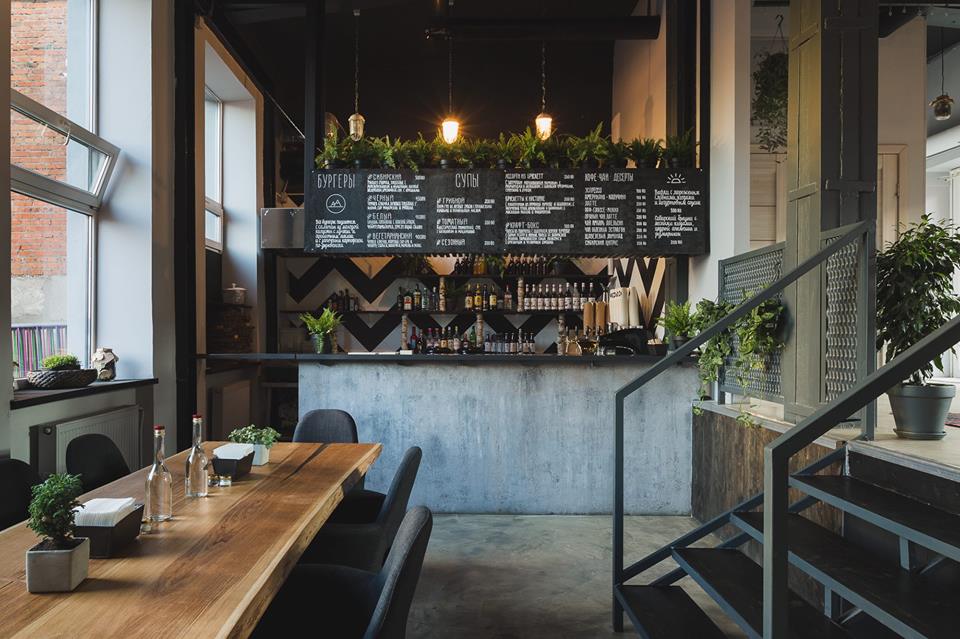 В меню: Сибирский бургер — 500 рублей, Крем-суп из лесных грибов с прованскими травами и трюфельным маслом — 200 рублей, Брускетты с паштетом из куриной печени и шалфеем; с запечённой уткой, апельсинами и карамелью; с рыбой и рикоттой — 300 рублей, Крафт-пиво — 300 рублей (0,5 литра), Ягодная «Маргарита» — 450 рублей, Крафт-бокс (чипсы из поленты, острое печенье с сыром чеддер и мятой, чипсы из водорослей с розовой гималайской солью, с брусничным и чесночным соусами) — 300 рублей, Вафли с мороженым, сливками, ягодами и йогуртовым соусом — 300 рублей, Сибирская настойка на кедровых орешках — 250 рублей.