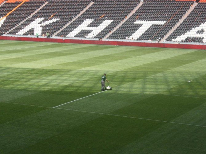 Вот началась разметка газона: он, к слову, на «Донбасс Арене» абсолютно роскошный — по рейтинговой линейке УЕФА, 98 баллов из 100 возможных.