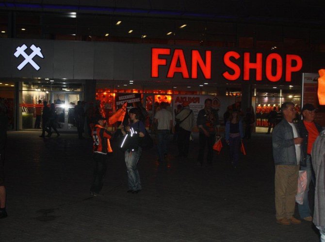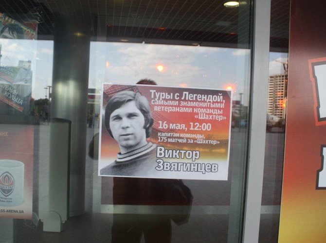 Фан-шоп закрыт, откроется он за два с половиной часа до игры, когда на стадион начнут пускать зрителей. Тогда здесь помимо всего прочего можно будет записаться на экскурсию, которую 16 мая проведет по арене Виктор Звягинцев, капитанивший в «Шахтере» 70-х. Цена взрослого билета — 150 гривен, что-то около 600 рублей. Для детей и юношества общение с динозавром советского футбола обойдется вдвое дешевле.«Туры с легендой» — самый свежий маркетинговый проект, продвигаемый администрацией «Донбасс-Арены». Туров таких пока было немного, собственно — всего два. Один — с вратарем Дегтеревым, второй — с нападающим Грачевым. На обоих, рассказывают, собрались группы человек по тридцать.