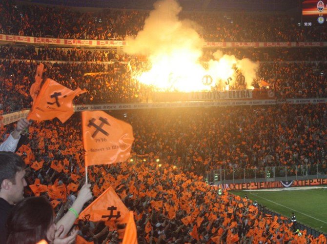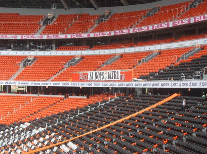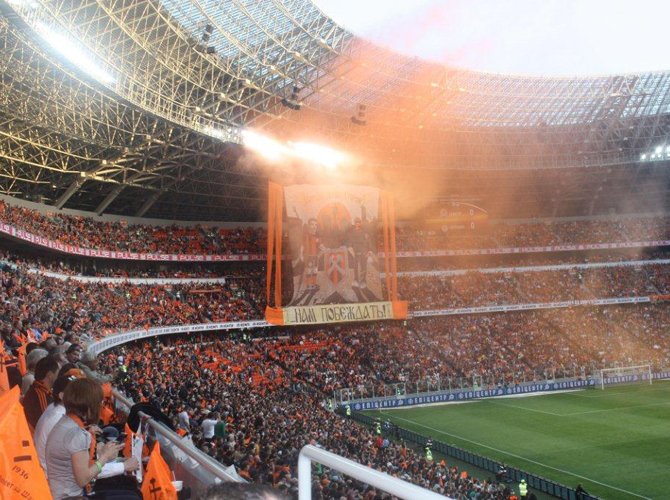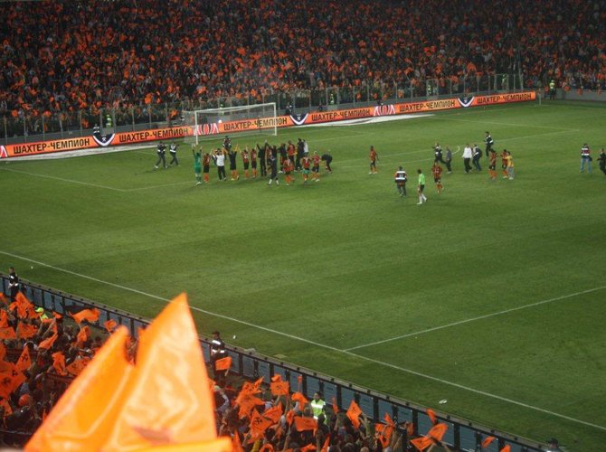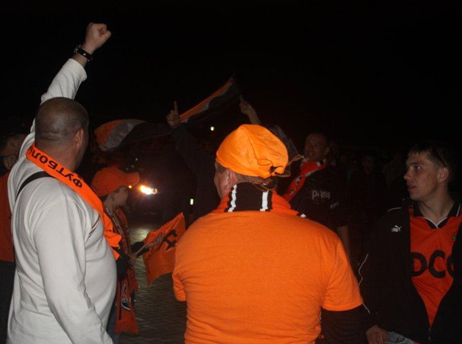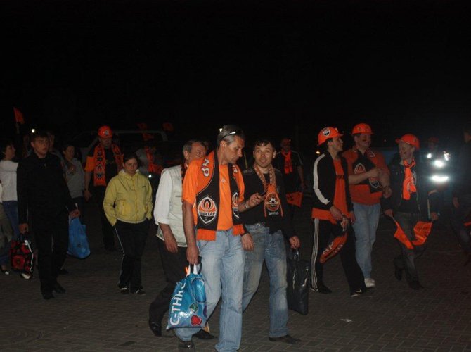 За несколько минут до начала матча над сектором местных ультрас всплывает в клубах оранжевого дыма гигантский баннер: «Здесь, на родной стороне, нам побеждать!» Динамики содрогаются первыми звуками клубного гимна — старинной шахтерской песни «Спят курганы темные». Ее поет весь стадион. Стартового свистка на трибунах не слышно. Поехали.