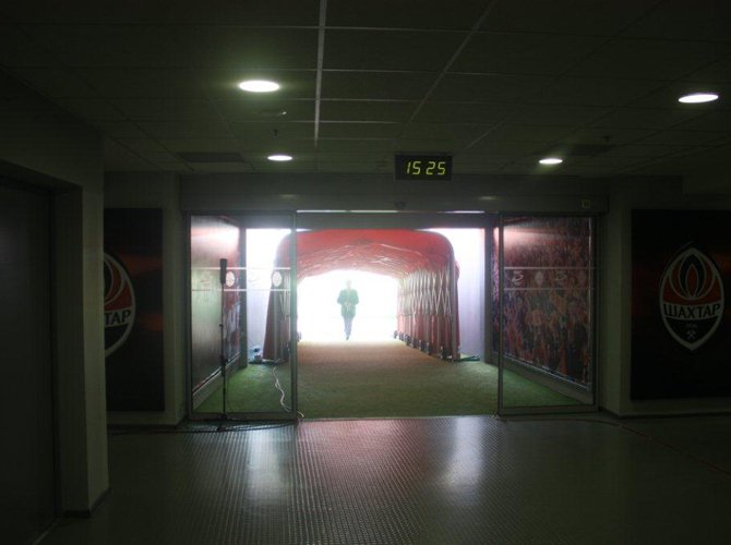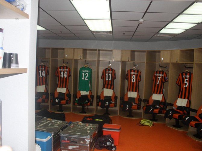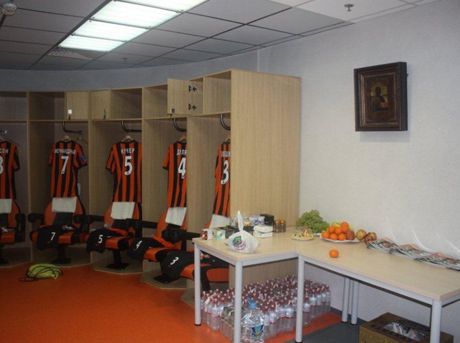 Донецкое время — три двадцать пять. В хозяйской раздевалке все готово к прибытию команды. Через три с половиной часа, пройдя по этому коридору, они выйдут на поле. Кое-кто, наверное, перед боем помолится — благо, все условия для уединенной молитвы здесь созданы. И попросит небо о том, чтобы «Склад для наград» этим вечером пополнился новыми единицами хранения.