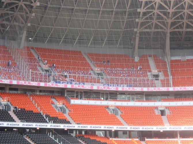 А на противоположной трибуне, в секторе, который в соответствие с 5-процентной гостевой квотой займут 2,5 тысячи приезжих из Киева, заботливо разложены бело-голубые флажки.