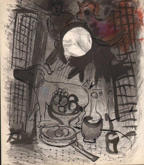 Литография "Терракотовый натюрморт" была создана художником совместно с галеристом и искусствоведом Жаком Лессенье в 1957 году. "Умение "чувствовать пальцами самый нерв литографии" Марк Шагал открыл в себе в годы американской эмиграции… Техника цветной литографии сохраняла все, чем он так дорожил – вдохновенный порыв, раскованность в выражении творческой мысли, чувственную яркость палитры", — говорится в сообщении.