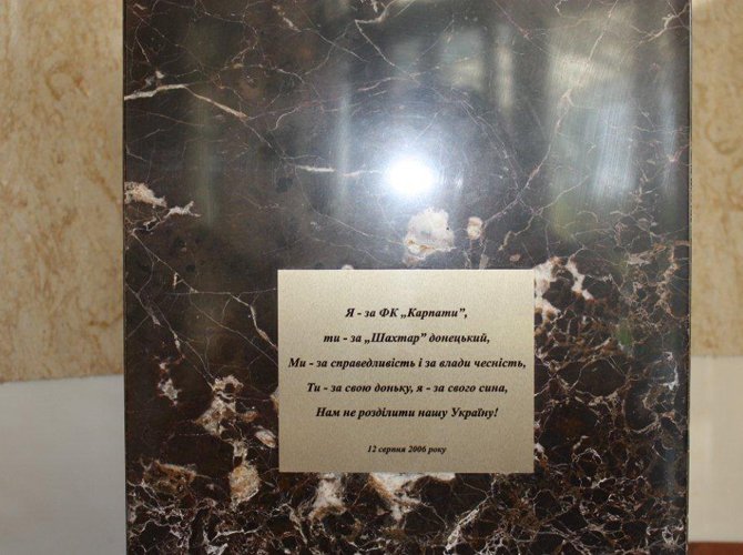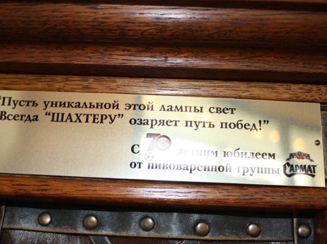 Фойе жилого корпуса еще хранит следы празднования 70-летия клуба, которое «Шахтер» отмечал четыре года назад, как водится, принимая подарки от родных и близких. Некоторые из дарителей сочли необходимым облечь свои чувства к новорожденному в стихотворную форму.
