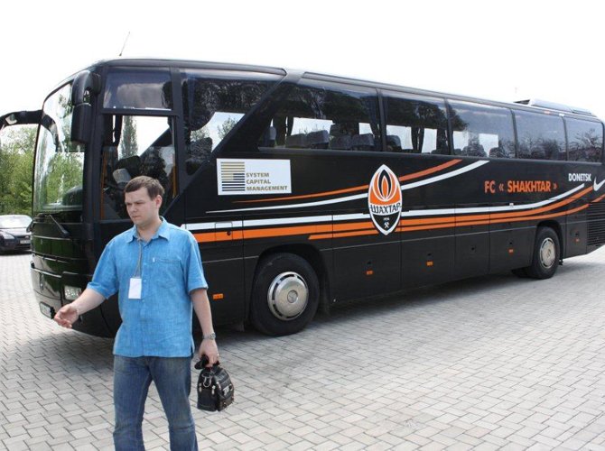 Клубный автобус. Накануне вечером, 5 мая, он доставил в Киршу футболистов «Шахтера», только что побивших киевское «Динамо» и ставших чемпионами Украины. Говорят, по такому случаю команда гуляла до четырех утра. Сегодня у нее — официальный выходной.