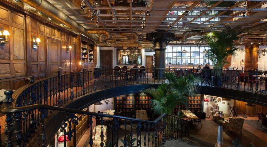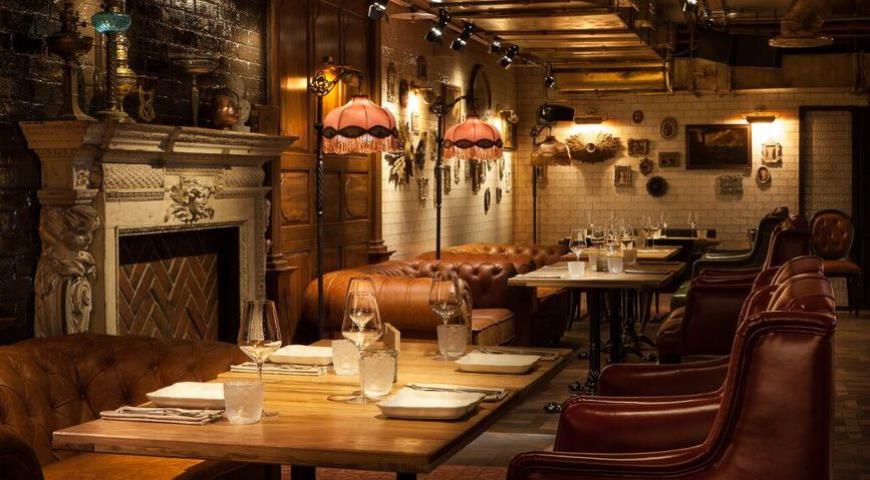 В интерьере читаются штрихи зажиточного купеческого быта, перенесенного в XXI век: обитые кожей тяжелые кресла на лапах, дубовые панели и антикварные шкафы сплетены в причудливый лофтовый дизайн вместе с индустриальными трубами и обнаженными вентиляционными отводами. Стиль строгий, темный, маскулинный вступает в явное противоречие с легкомысленным названием на вывеске.