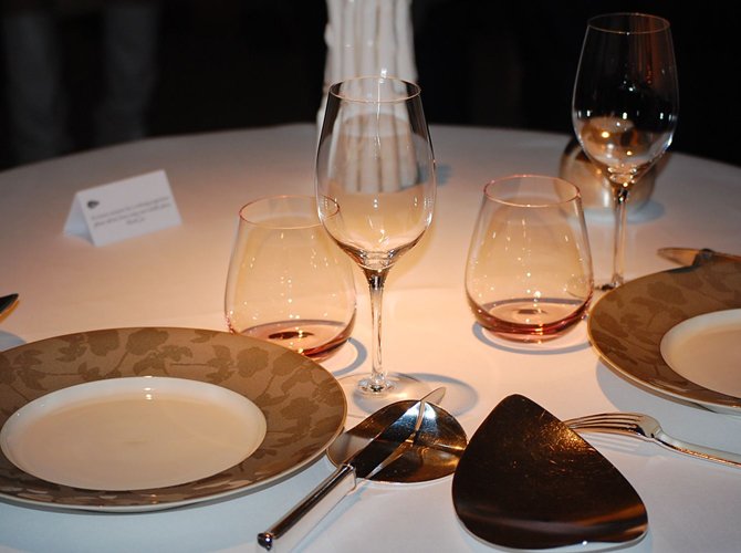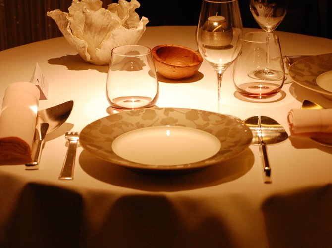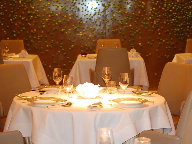 Он отделен от общего зала сверкающим пологом, спускающимся с потолка до самого пола и ограждающим стол и сидящих за ним гостей от остальных посетителей. Только за этим столом гости едят из посуды от Hermes, которую, впрочем, при желании могут поменять на любую другую. Смена времени года влечет за собой и смену посуды, декорированной в соответствие с наступившим сезоном.