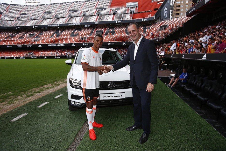 Июль 2016 года, «Месталья». Глава валенсийского представительства Volkswagen Дионисио Лопес вручает новобранцу клуба Нани ключи от автомобиля, предоставленного компанией-спонсором