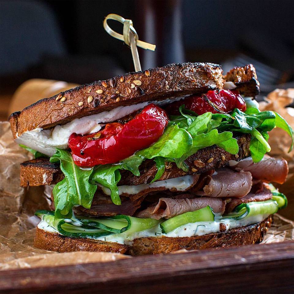 В меню: Салаты и холодные закуски: Салат с толстым краем мраморной говядины — 390 рублей Домашние шпроты — 270 рублей Фиш & чипс — 370 рублей Сэндвич с пастрами — 400 рублей.